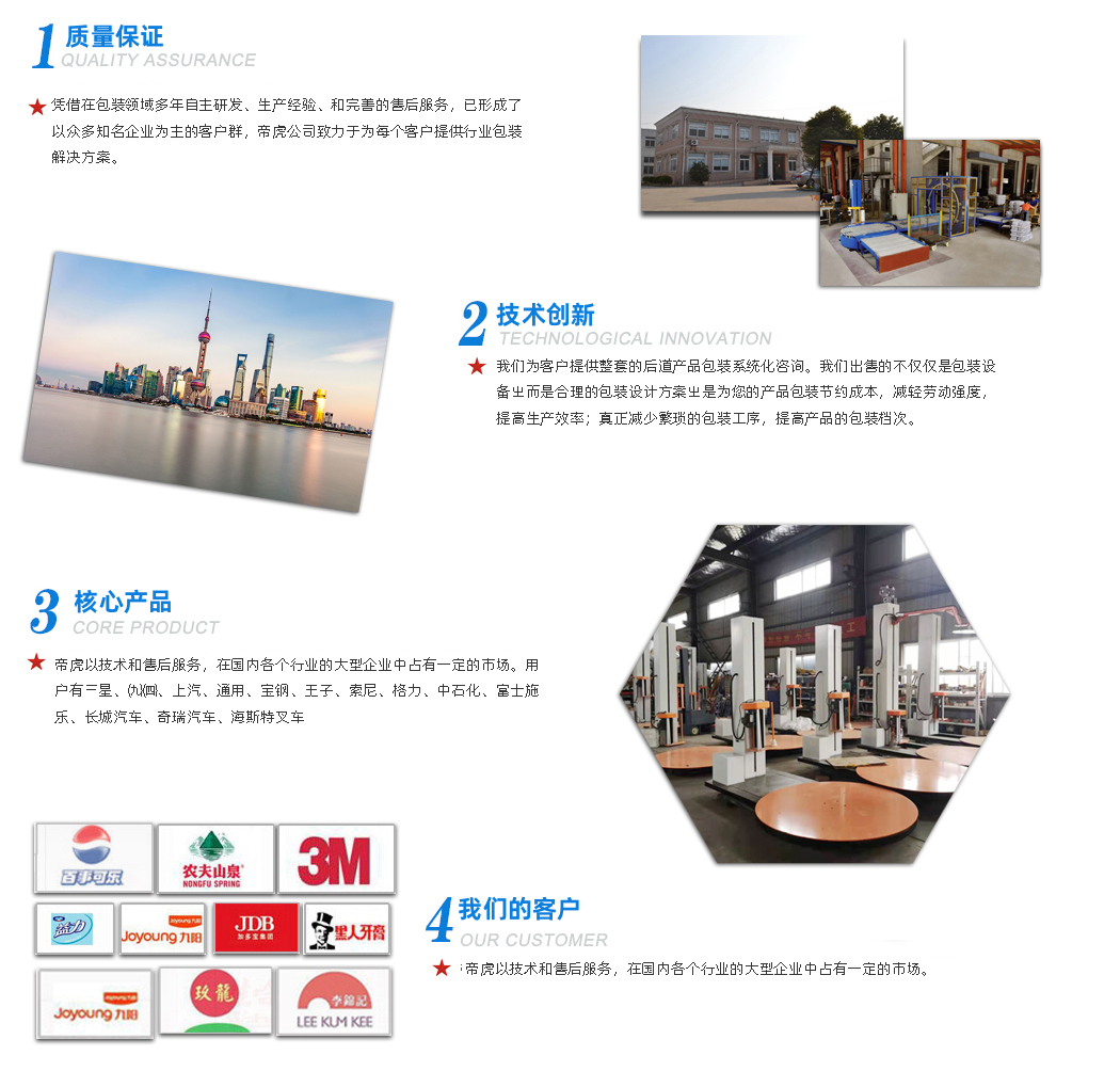 帝虎包裝設備(上海)有限公司是一家從事現代物流一體化運輸包裝解決方案的專業提供商!公司自成立至今,憑借在包裝領域多年自主研發、生產經驗、和完善的售后服務,已形成了以眾多知名企業為主的客戶群,帝虎公司致力于為每個客戶提供行業包裝解決方案。